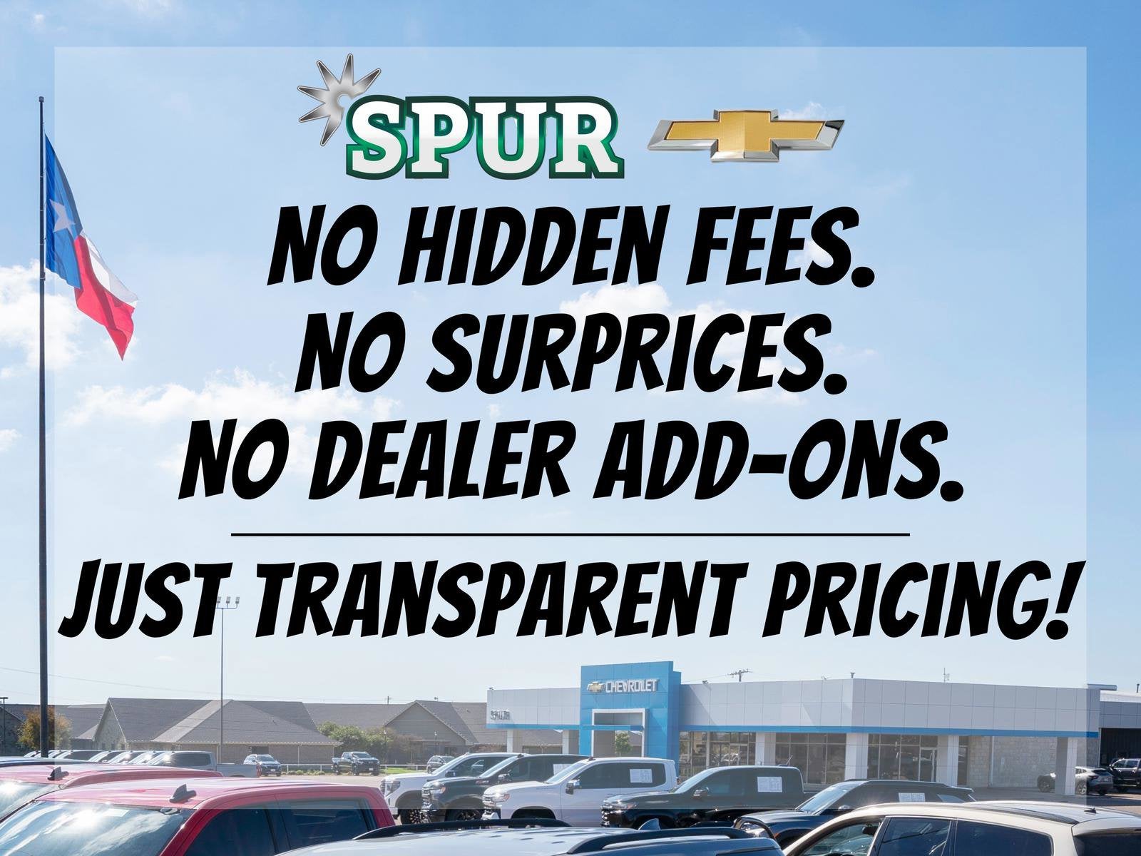 Buy with confidence at SPUR Chevrolet GMC in Gatesville! Every vehicle is fully inspected by our certified techs and comes with a detailed folder—inspection report, Carfax, and service history included. No-haggle Spur Internet Pricing means real-time market value—no guesswork, no games. We take all trades and will buy your car even if you don’t buy ours! Nationwide shipping available. Serving Gatesville, Waco, Killeen, Temple & beyond! Price includes: $1000 - Chevrolet Consumer Cash Program. Exp. 03/31/2026