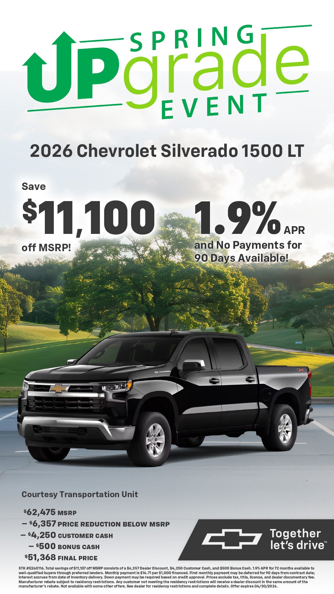 STK #E260116. Total savings of $11,107 off MSRP consists of a $6,357 Dealer Discount, $4,250 Customer Cash, and $500 Bonus Cash. 1.9% APR for 72 months available to well-qualified buyers through preferred lenders. Monthly payment is $14.71 per $1,000 financed. First monthly payment may be deferred for 90 days from contract date; interest accrues from date of inventory delivery. Down payment may be required based on credit approval. Prices exclude tax, title, license, and dealer documentary fee. Manufacturer rebate subject to residency restrictions. Any customer not meeting the residency restrictions will receive a dealer discount in the same amount of the manufacturer's rebate. Not available with some other offers. See dealer for residency restrictions and complete details. Offer expires 04/30/2026.